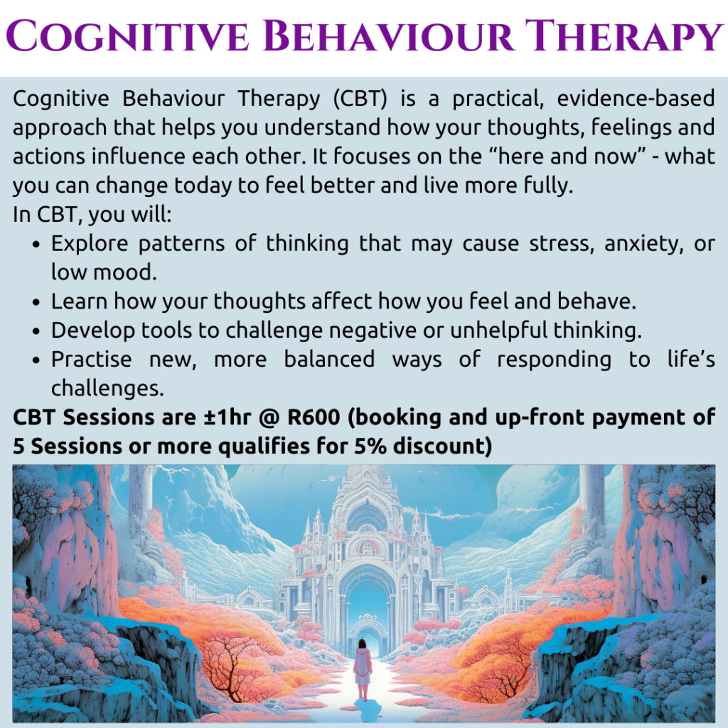 Cognitive Behaviour Therapy (CBT) is a practical, goal-focused form of therapy that helps you identify and change unhelpful thought patterns and behaviours. It’s based on the idea that our thoughts, feelings, and actions are connected — by learning to recognise and shift negative thinking, you can improve your emotional well-being and develop healthier ways of coping with life’s challenges.